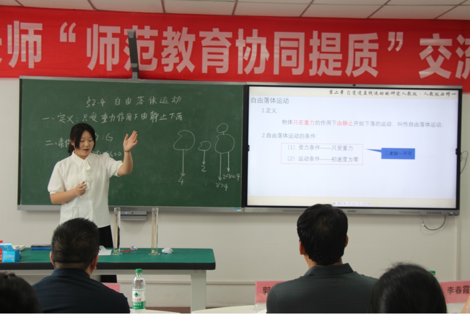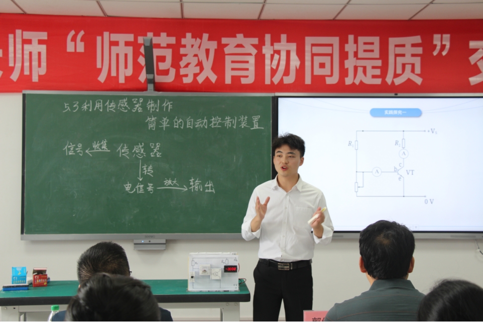 在教学技能展示环节,来自两校的6名学生依次登台展示。其中,我校2名22级物理师范本科生紧扣学科重难点,分别以《光的偏振》、《动量定理》为课题,凭借扎实的专业功底与创新的教学设计,将晦涩的物理原理转化为生动的课堂呈现;“重师-长师协同提质联合培养”学生则围绕《自由落体运动》展开精彩展示,以清晰的逻辑和巧妙的实验设计,充分展现跨校联合培养的教学成果。长师3名学生分别围绕《热机的效率》、《电能的输送》、《利用传感器制作简单的自动控制装置》三大课题,通过理论讲解与实践演示相结合的方式,展现出对知识的深刻理解与创新应用能力。展示结束后,学生们逐一分享实验设计思路,老师们根据展示内容与实验分享展开热烈探讨,在思维碰撞中深度挖掘教学技能展示背后的创新理念与实践价值。