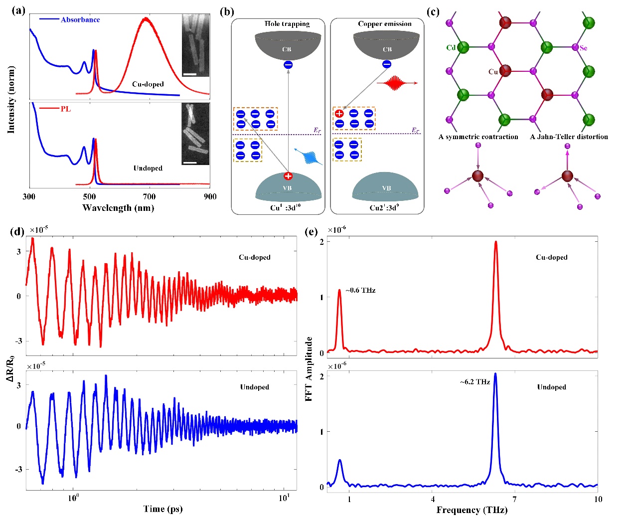 针对上述问题,研究团队与合作者创新利用飞秒分辨的相干声子光谱技术,直接测量了CdSe胶体量子阱中由Cu原子掺杂引起的晶格应变。研究发现,Cu掺杂诱导的局部晶格收缩会产生压电场,并通过光激发下载流子的局域化行为对该压电场进行“光学屏蔽”,从而激发相干态声学声子。通过对比掺杂与未掺杂样品的声子振动相位、寿命和幅度,研究团队成功提取出掺杂诱导的压电场强度,约为102 V/m。