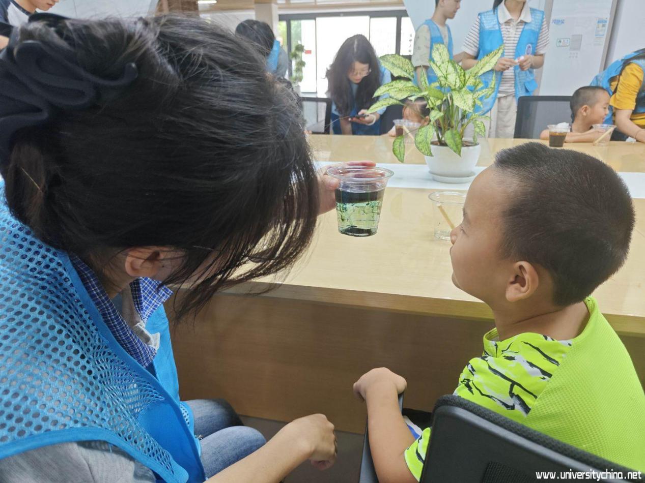 志愿者带领孩子完成“烟雾泡泡器”实验